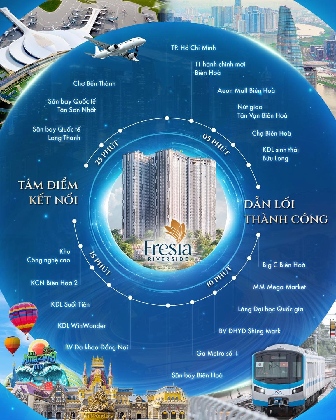 Fresia Riverside là dự án căn hộ cao tầng ven sông đặc sắc tại TP. Biên Hòa, Đồng Nai. Dự án được định hướng trở thành biểu tượng sống mớ iđẹp và hiện đại cho không gian đô thị ven sông đầy tiềm năng tại khu vực cửa ngõ TP.HCM.