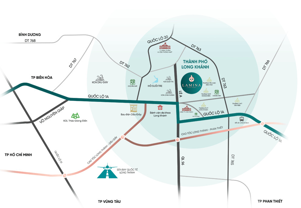 Nhà phố thương mại Lamina tọa lạc tại mặt tiền đường Lê A, phường Bảo Vinh, thành phố Long Khánh, tỉnh Đồng Nai. Đường Lê A là trục giao thông huyết mạch kết nối trực tiếp với Quốc lộ 1A, cao tốc Long Thành – Phan Thiết, cao tốc Long Thành – Dầu Dây…